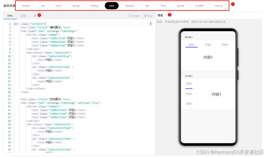如下图1所示:①区域为可实现在线预览的组件案例场景,②区域为组件示例代码查看与编辑区域,③区域为预览区。