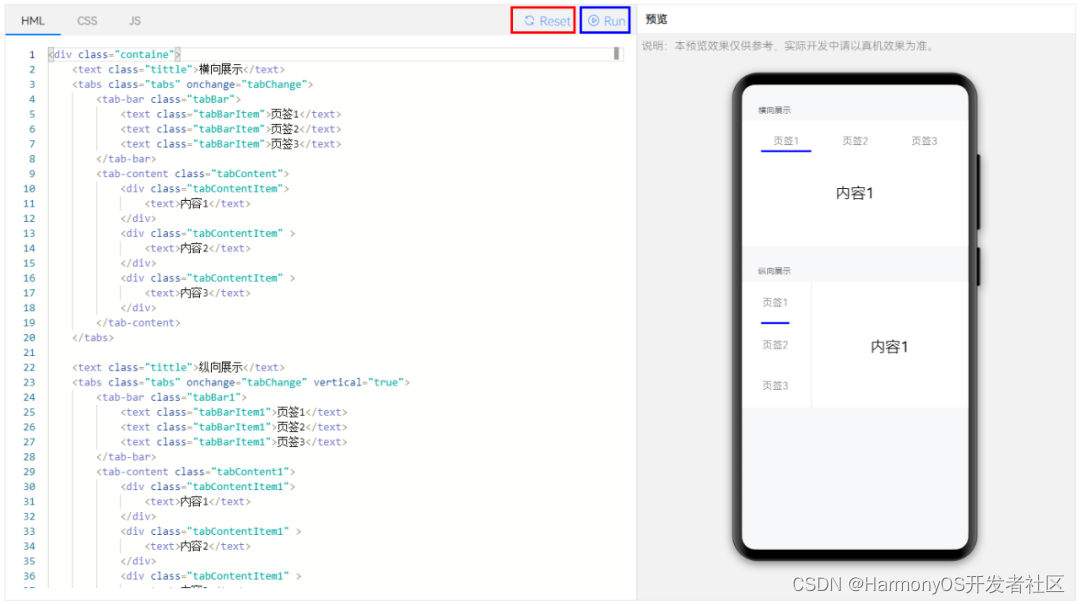 Playground在线预览界面左侧为代码区、右侧为预览区。开发者们通过修改左侧HML、CSS、JS语言代码,即可实现快速开发、一键编译。