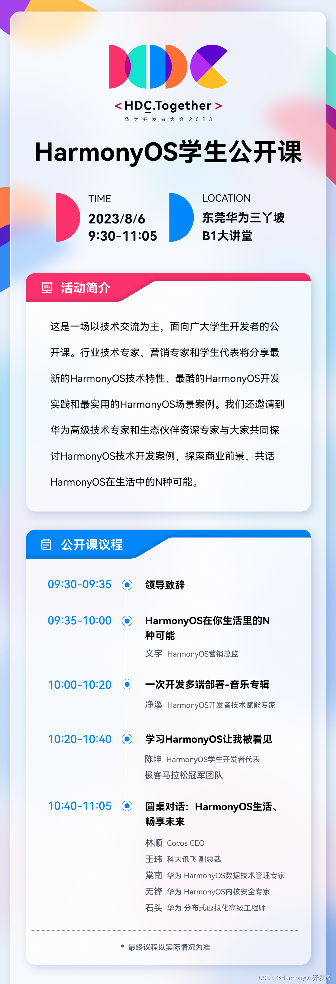 8月6日9:30,HarmonyOS学生公开课盛大开启,关注点在于HarmonyOS的操作系统生态前景和技术革新,共同探讨其带来的无限可能性与时代发展机遇。