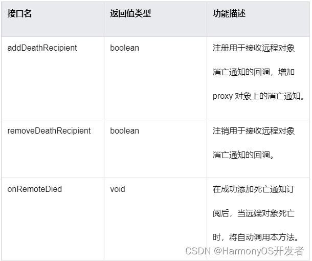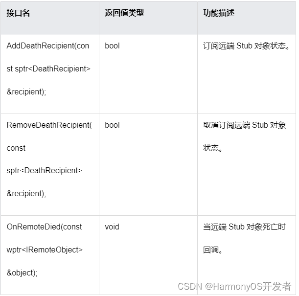 IPC/RPC 提供对远端 Stub 对象状态的订阅机制, 在远端 Stub 对象消亡时,可触发消亡通知告诉本地 Proxy 对象。这种状态通知订阅需要调用特定接口完成,当不再需要订阅时也需要调用特定接口取消。使用这种订阅机制的用户,需要实现消亡通知接口 DeathRecipient 并实现 onRemoteDied 方法清理资源。该方法会在远端 Stub 对象所在进程消亡或所在设备离开组网时被回调。值得注意的是,调用这些接口有一定的顺序。首先,需要 Proxy 订阅 Stub 消亡通知,若在订阅期间 Stub 状态正常,则在不再需要时取消订阅;若在订阅期间 Stub 所在进程退出或者所在设备退出组网,则会自动触发 Proxy 自定义的后续操作。