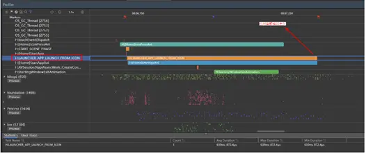 冷启动过程最大连续丢帧数即在冷启动过程中的最大连续丢帧数,其性能衡量的起点为用户点击应用图标离手帧时间,止点为应用启动页图标铺满屏幕的首帧时间。