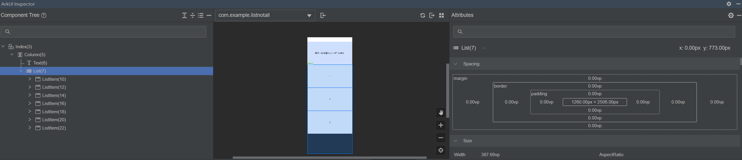 - 最后可以利用ArkUI Inspector可以看到List组件超出屏幕范围,超出的距离刚好是上面Text组件占据高度200vp。