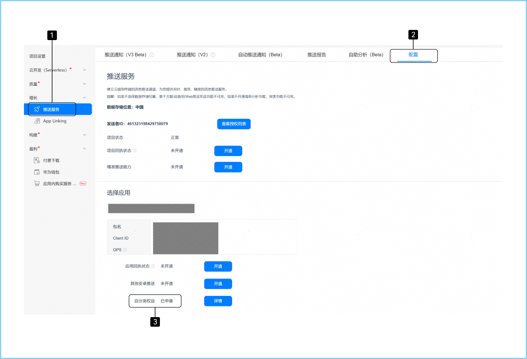 - 确认是否申请了自分类权益。登录AppGallery Connect网站,点击“我的项目”。在项目列表中找到您的项目,通过“推送服务 > 配置”,在“配置”页签下选择需要申请自分类权益的应用,查看自分类权益是否已申请。