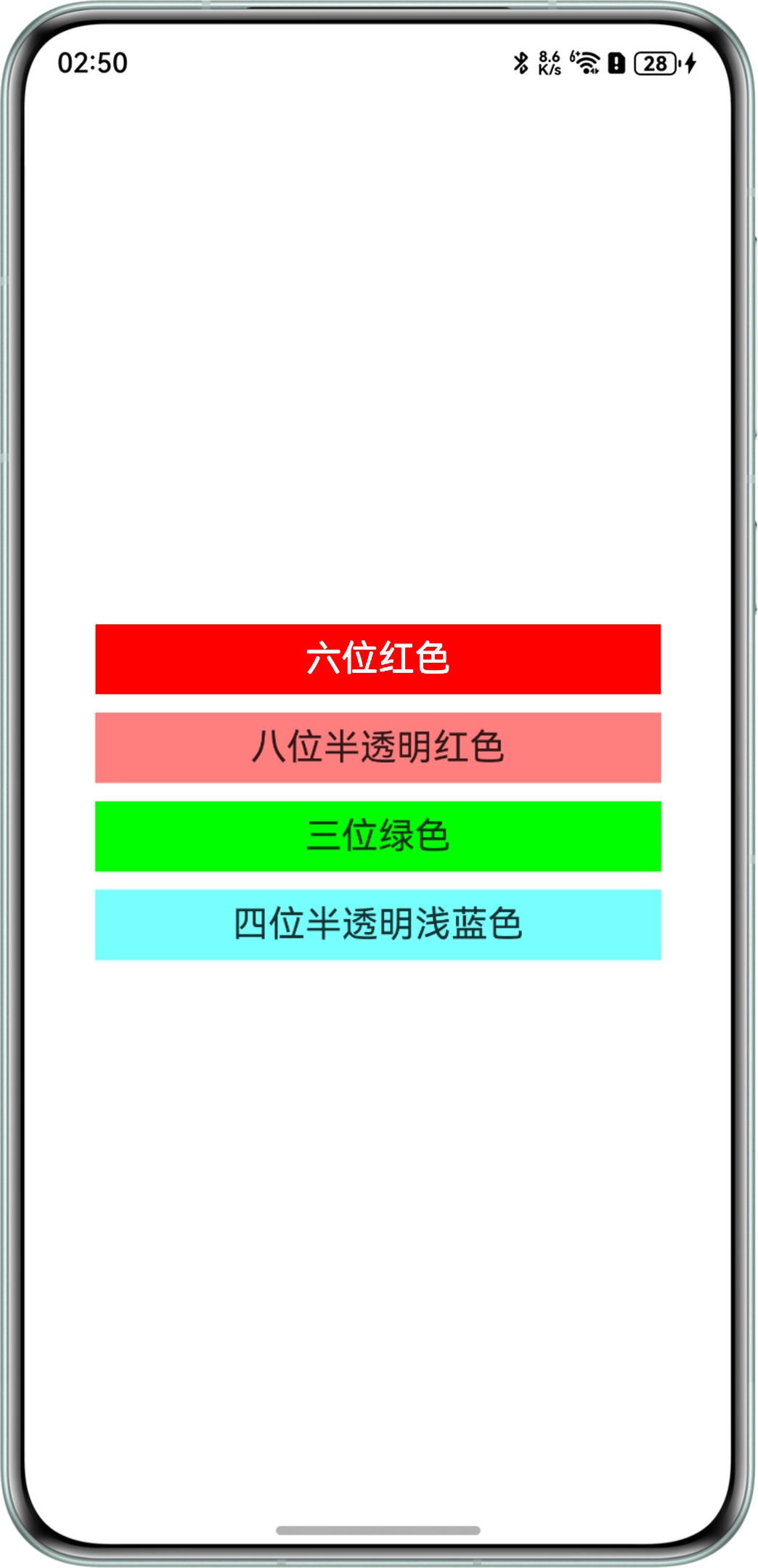 - 八位带透明度格式:#80FF0000表示半透明红色;FF00FF00表示不透明绿色。
