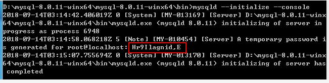 3.输mysqld --initialize --console成功后,有一个初始化密码记得保存,红色方框标记。