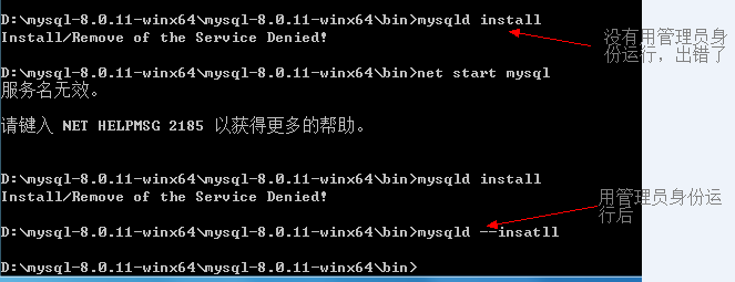 4..输入mysqld install 报“Install/Remove of the Service Denied”,没有用管理员身份去运行CMD。