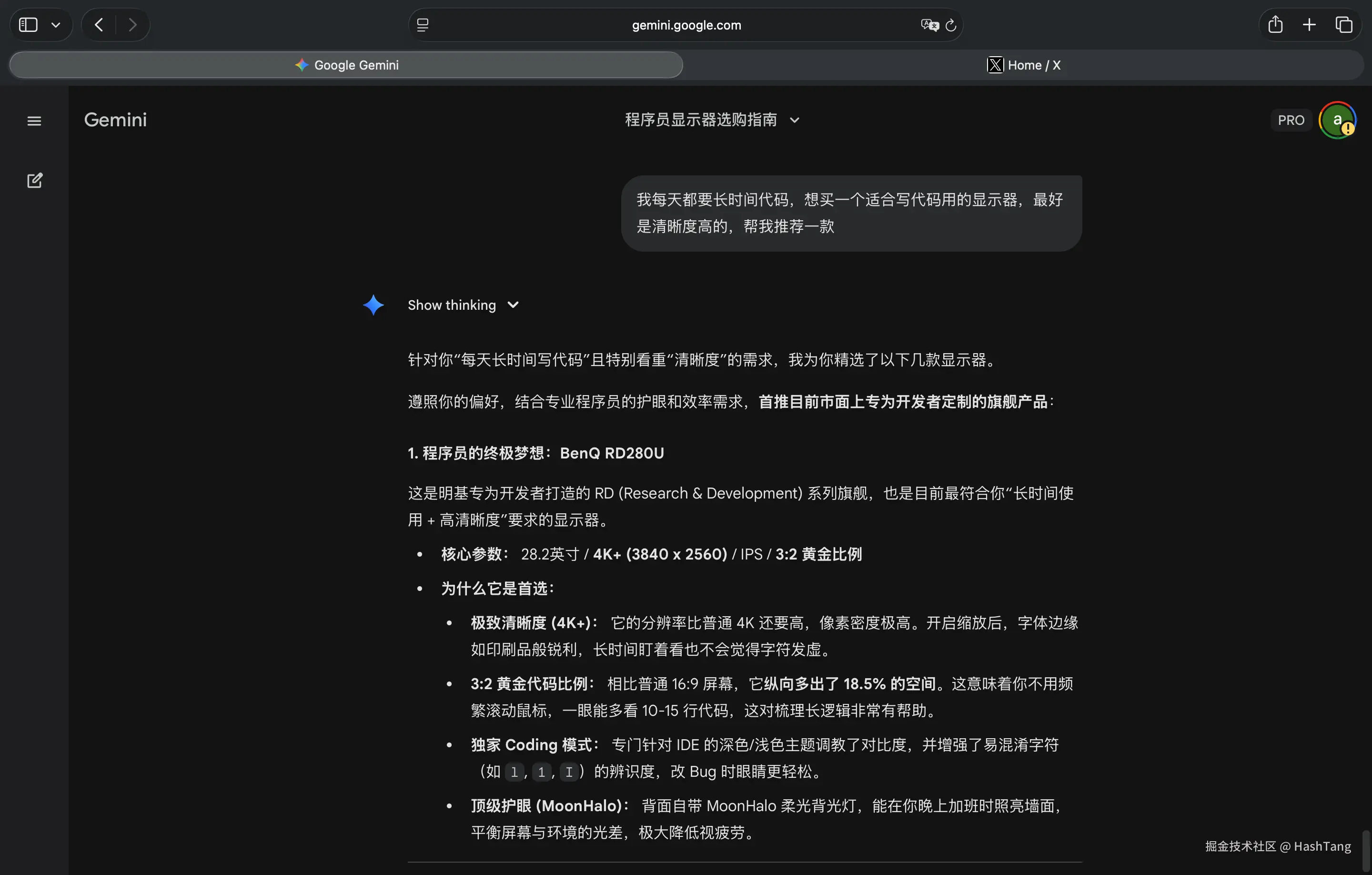 为了解决“划触摸板划到手酸”和“看 Diff 看到眼瞎”的问题,我准备换个显示器,于是我把问题抛给了 Gemini,习惯了 AI 不离手之后,日常有问题第一个想到的就是他。