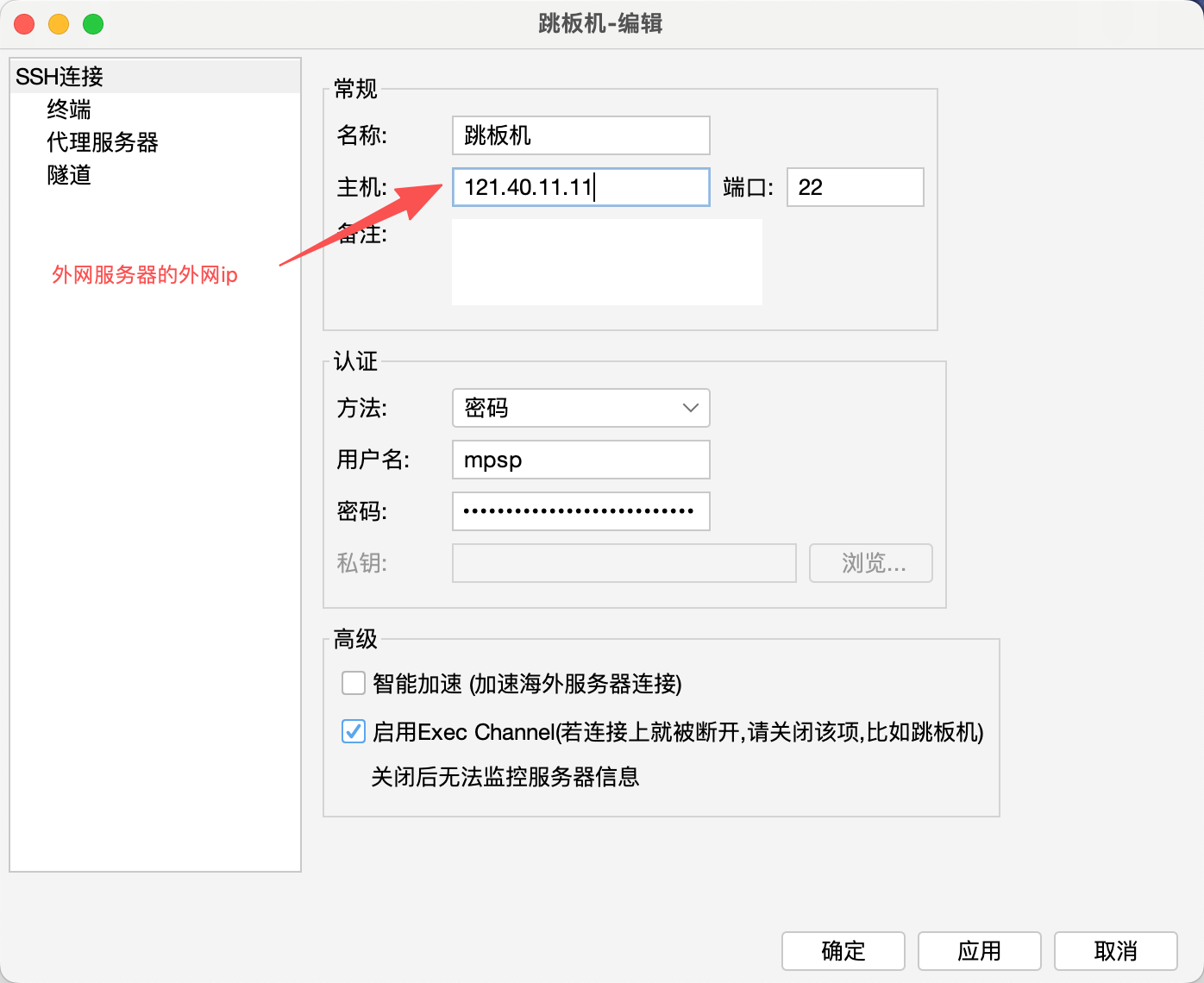 输入跳板机(支持外网的机器)的账号密码ip 连接跳板机
