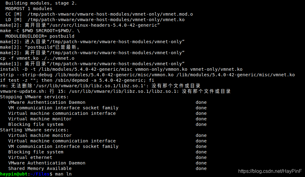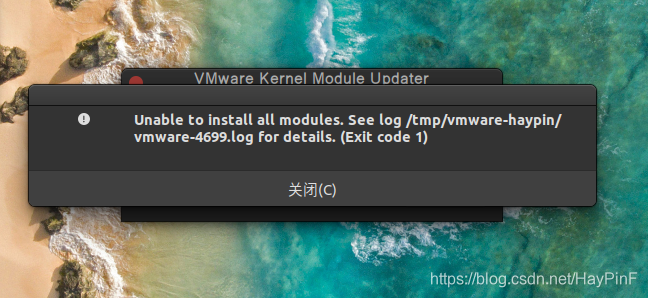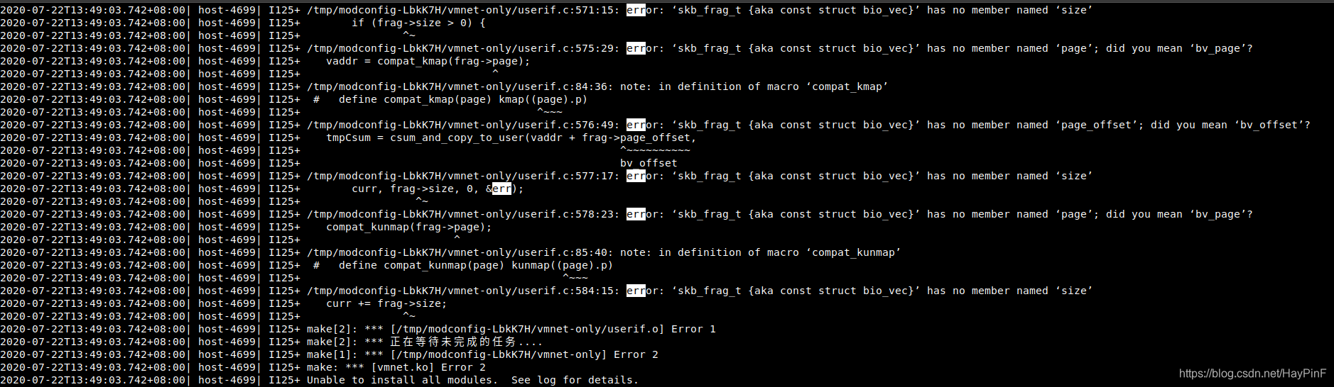 打开/tmp/vmware-haypin/vmware-4699.log有发现error,看起来是在make编译一些文件时出错了,