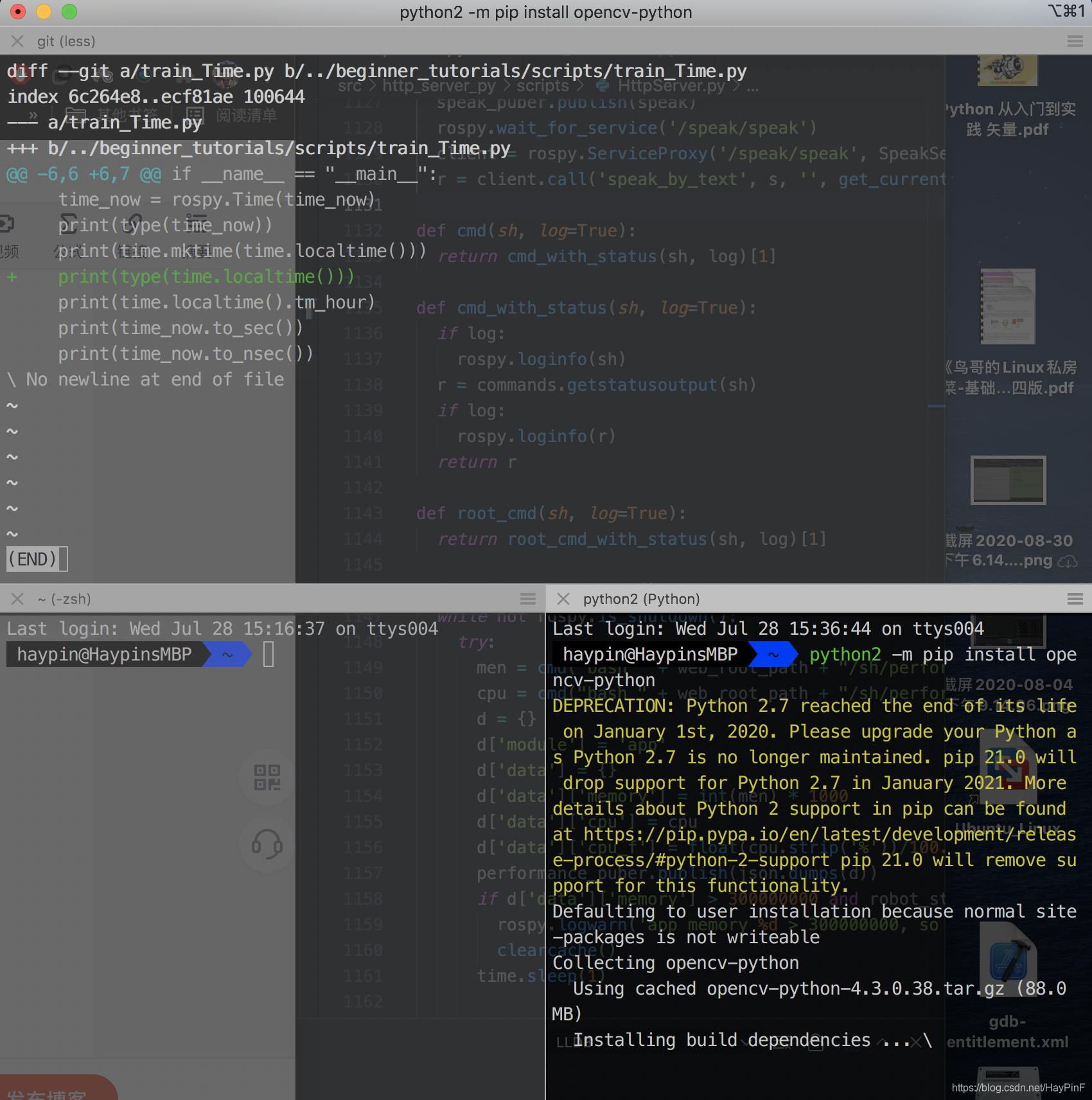 iTerm2 allows you to divide a tab into many rectangular "panes", each of which is a different terminal session. The shortcuts cmd-d and cmd-shift-d divide an existing session vertically or horizontally, respectively. You can navigate among split panes with cmd-opt-arrow(cmd-opt-箭头) or cmd-[(就是Finder的go back) and cmd-](Finder的go forward). You can "maximize" the current pane--hiding all others in that tab--with cmd-shift-enter. Pressing the shortcut again restores the hidden panes.