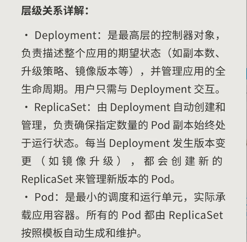 ReplicaSet/Deployment:管理 Pod 的副本数量,确保指定数量的 Pod 始终运行。