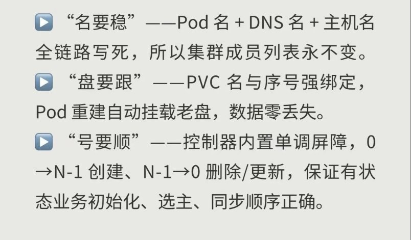3、唯一性:每个实例通常有唯一的标识,如数据库的主节点或从节点。4、持久化存储:需要持久化存储卷来保存状态信息。