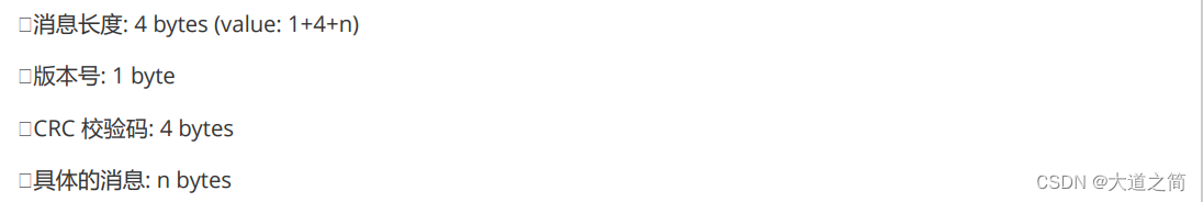 消息由一个固定长度的头部和可变长度的字节数组组成。头部包含了一个版本号和 CRC32 校验码。