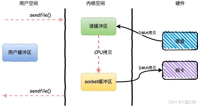 sendfile方式是新增的一个系统调用函数,产生2次DMA拷贝+1次CPU拷贝,但是只有2次上下文切换。因为只有一次调用,减少了上下文的切换,但是用户空间对IO数据不可见,适用于静态文件服务器。