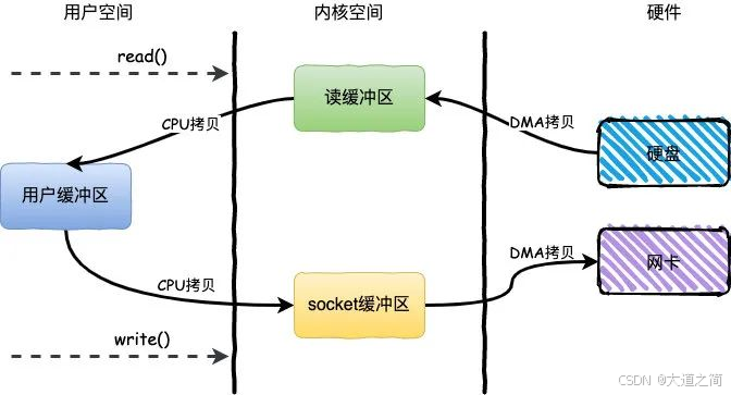 传统的IOread+write方式会产生2次DMA拷贝+2次CPU拷贝,同时有4次上下文切换。