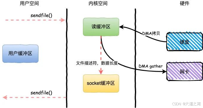 DMA gather和sendfile一样数据对用户空间不可见,而且需要硬件支持,同时输入文件描述符只能是文件,但是过程中完全没有CPU拷贝过程,极大提升了性能。