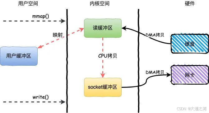 而通过mmap+write方式则产生2次DMA拷贝+1次CPU拷贝,4次上下文切换,通过内存映射减少了一次CPU拷贝,可以减少内存使用,适合大文件的传输。