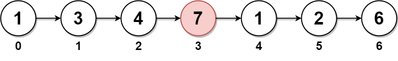 输入:head = [1,3,4,7,1,2,6] 输出:[1,3,4,1,2,6] 解释: 上图表示给出的链表。节点的下标分别标注在每个节点的下方。 由于 n = 7 ,值为 7 的节点 3 是中间节点,用红色标注。 返回结果为移除节点后的新链表。