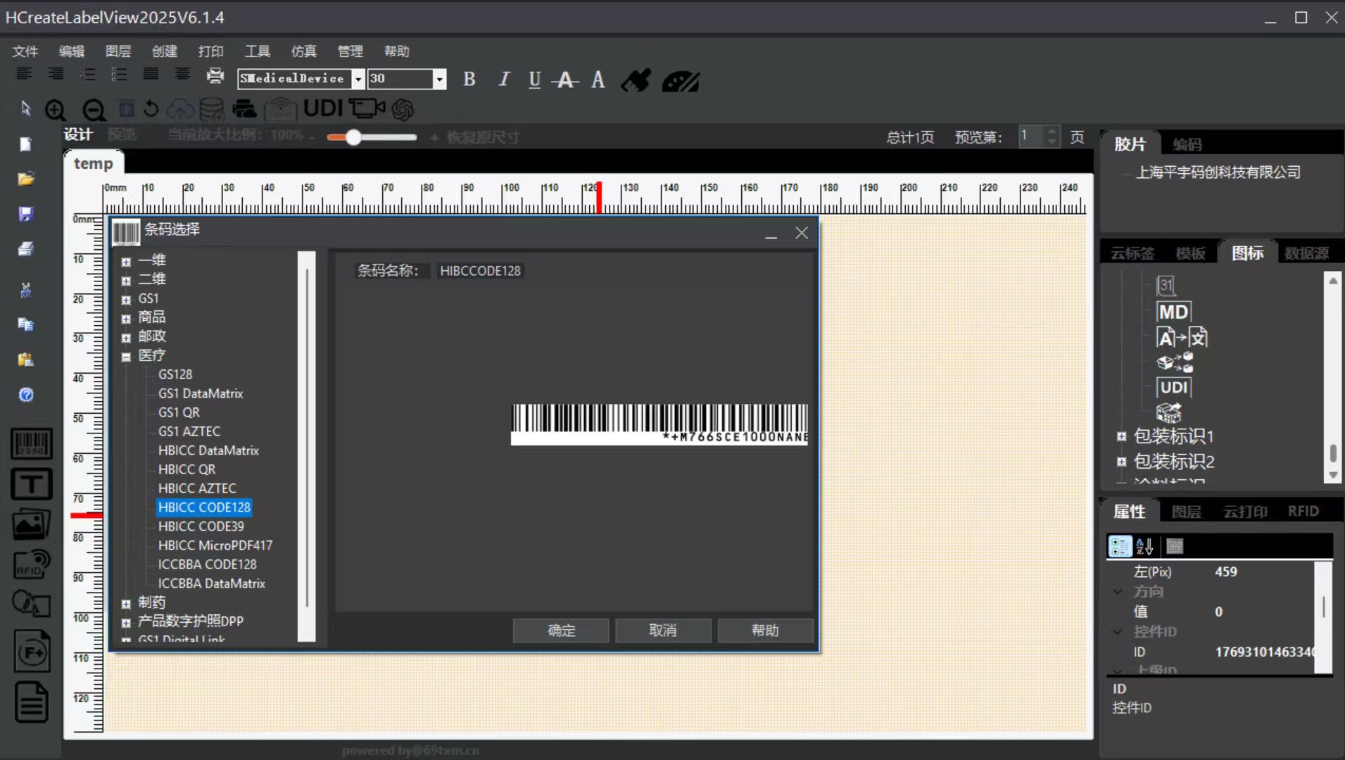 - 在条码选择器中选择HIBCC code128码