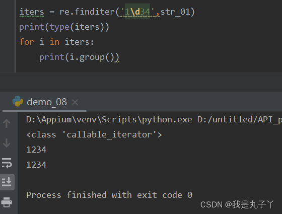 4、re.finditer函数 使用正则匹配后,直接再用循环去操作匹配后的字符串,和findall类似,在字符串中找到正则表达式所匹配的所有子串,并把它们作为一个迭代器返回