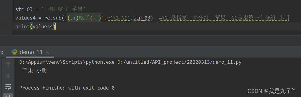 values4 = re.sub('(.+)吃了(.+)',r'\2 \1',str_03) #\2 是指第二个分组 苹果 \1是指第一个分组 小明