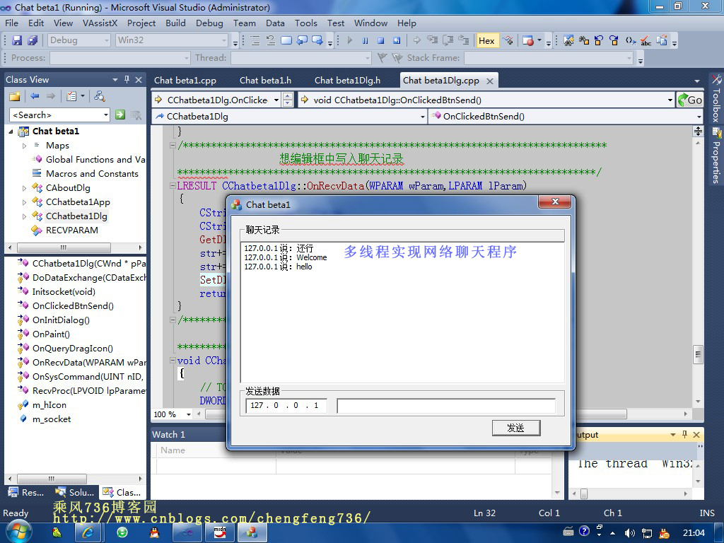 这样,整个程序就完成了。在这个小程序中,我还是按照网络编程的步骤一步一步实现的。用到的技术关键点有:创建新线程来接收数据;向线程函数传递参数。而且我用了在阻塞模式下的编程模式。