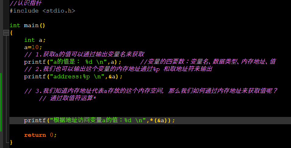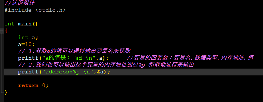 首先:我们知道,一个变量的四个要素(变量名、变量的数据类型、变量的值、内存地址)。我们平时做的事就是使用变量的名来访问变量的值,也可以通过取地址符&来获取变量的地址,就比如下面这张图: