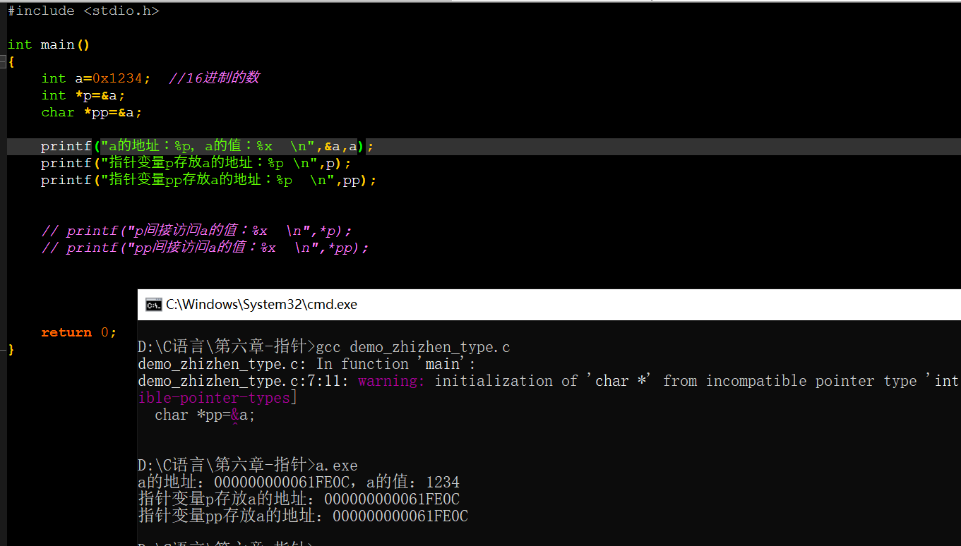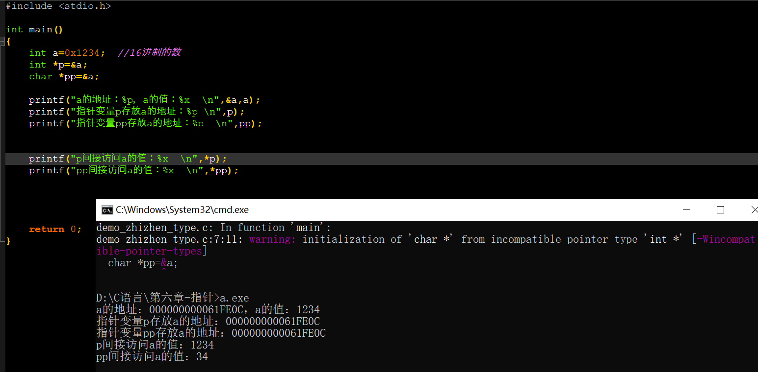 我们编译结果有一个警告:pp指针变量的类型不匹配。但是指针变量p和pp虽然数据类型不同,但继续编译出来的结果没有错,看起来并没有问题,那我们继续往下看: