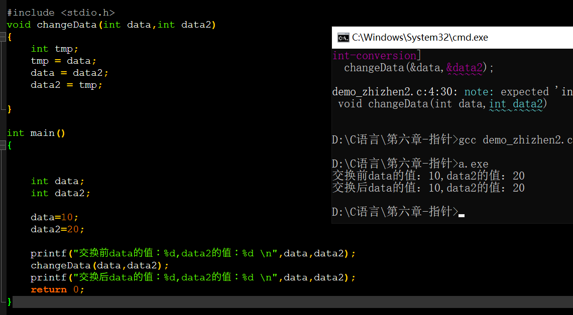 也就是说,实参的值通过值传递(值拷贝)给了形参,并在函数中也确实进行了改变,但是函数调用结束时这个改变的值也跟随着形参被释放而被释放了,因此main中实参的值并没有进行交换,而是原样输出。