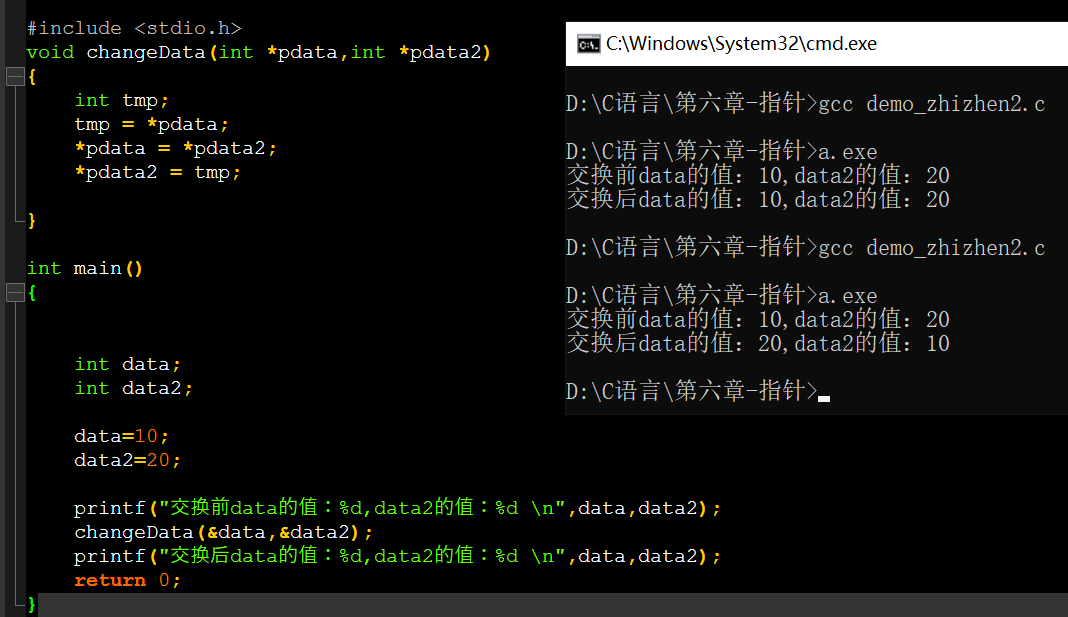 指针变量接收到值了(也就是main中实参的地址),那么通过取值运算符*就能访问到传过来对应地址的值,也就是说*pdata=10,*pdata2=20,尽管形参最后会被释放,但是因为他操作的就是main中data和data2内存地址其对应的值,所以,最终main中data和data2的值进行了交换。