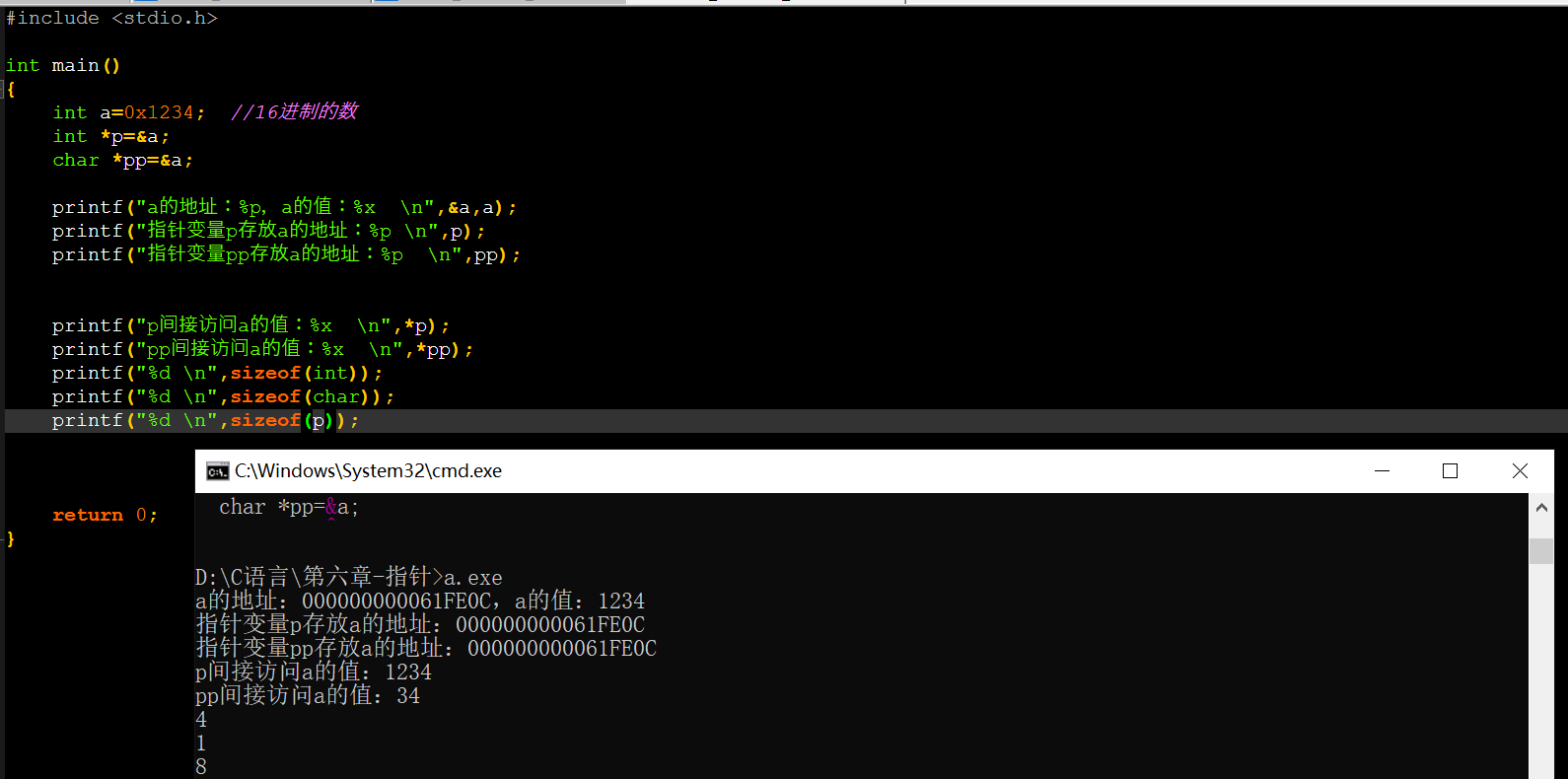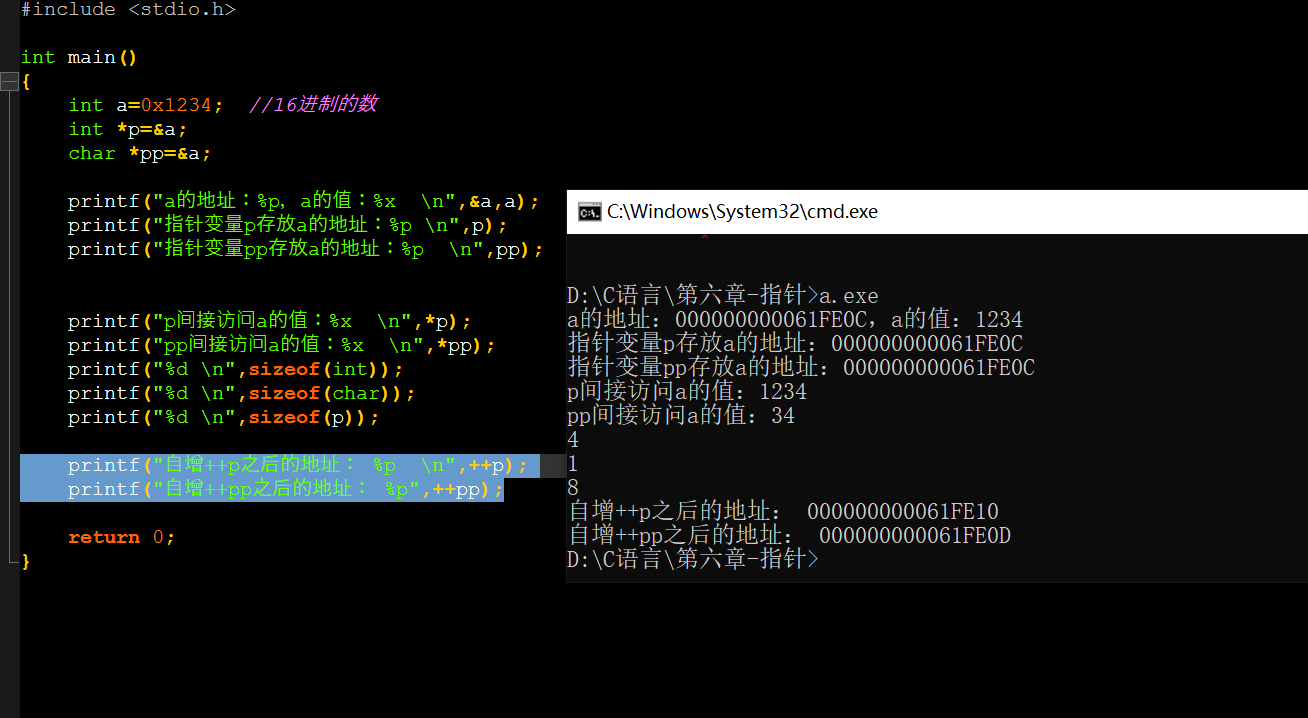 高亮的部分是进行地值自增的操作,可以看到p自增与pp自增之后得到的地址是不一致的。因为p是int类型4个字节(32位),pp是char类型1个字节(8位),(地址也是16进制的),a也是int类型32位,因此刚开始地址都是FE0C,p进行自增后具有增一位补0也就是FE10;pp进行自增就只能是FE0D。