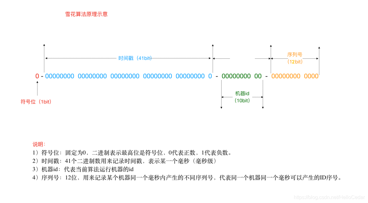 雪花算法是一个算法,基于这个算法可以生成ID,生成的ID是一个long型,那么在Java中一个long 型是8个字节,算下来是64bit,如下是使用雪花算法生成的一个ID的二进制形式示意∶