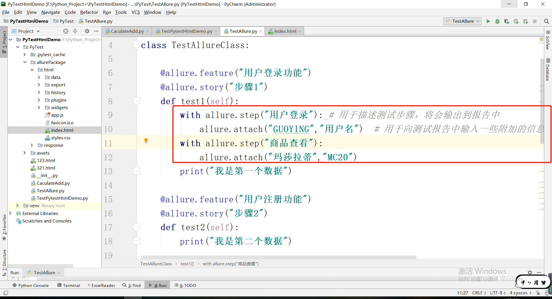 4.4with allure.step("用户登录"): # 用于描述测试步骤,将会输出到报告中