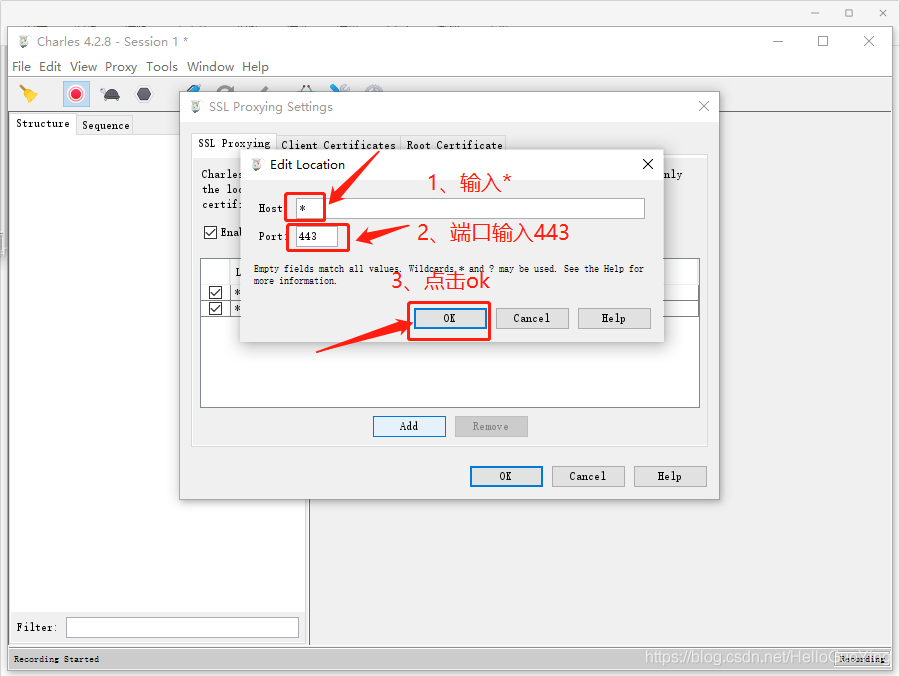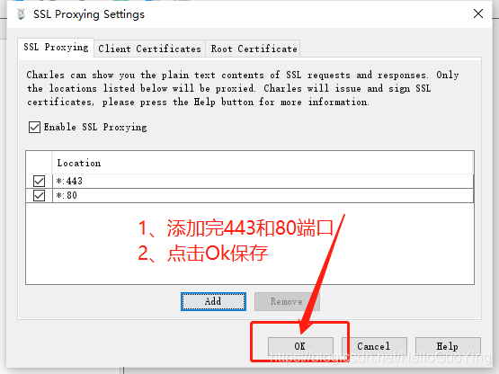 六、点击Proxy的SSL Proxying Settings选项,配置抓包的端口(常用的端口443,80等等)配置过的可以跳过此步骤!