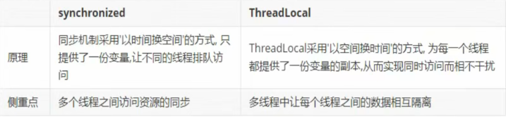 虽然ThreadLocal与synchronized关键字都能用于处理多线程并发访问变量的问题,但是两者处理问题的角度和思路是不一样的。区别如下: