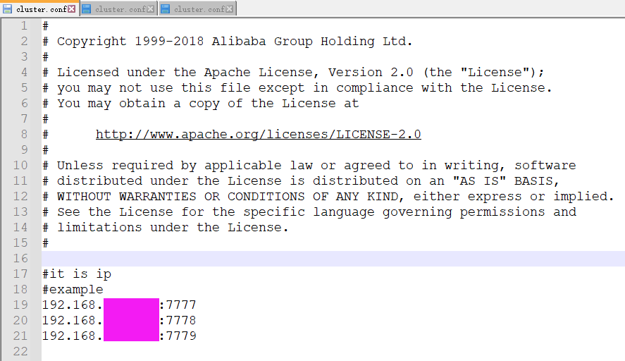 (4)拷贝cluster.conf.example 为 cluster.conf,并添加节点配置;
