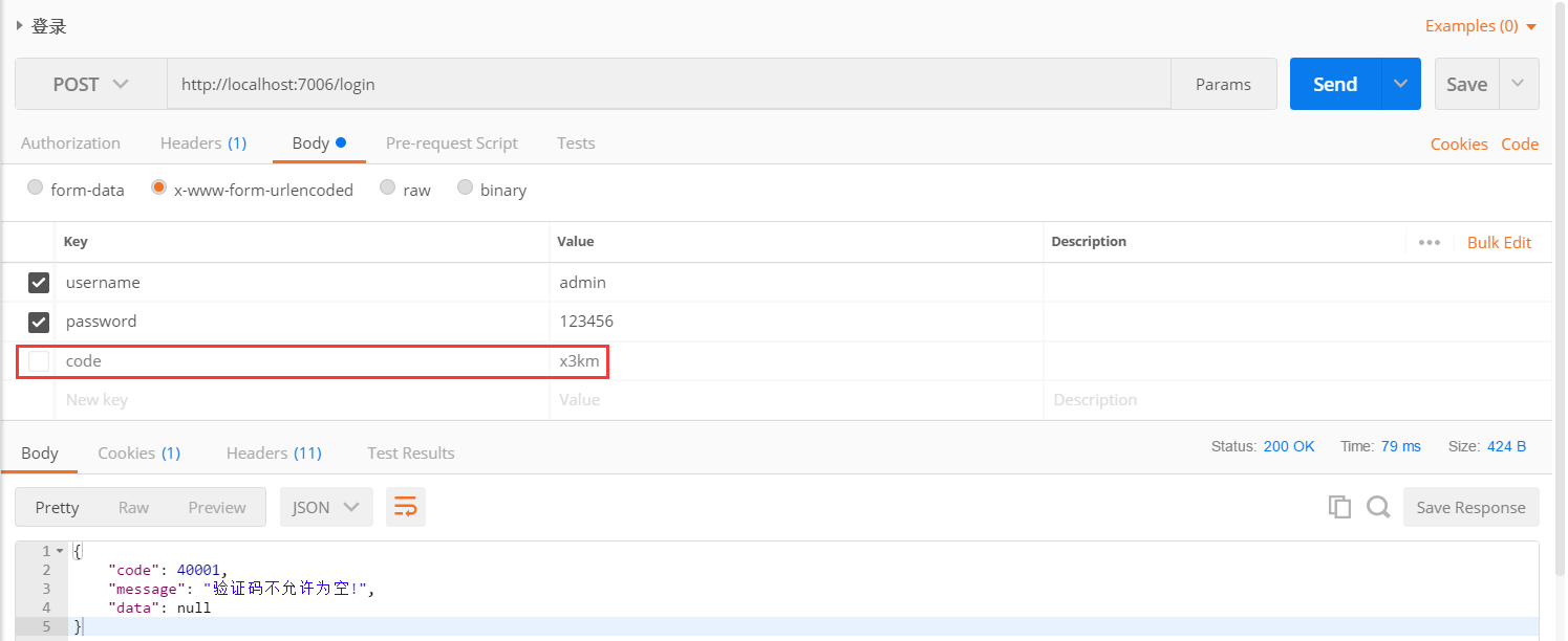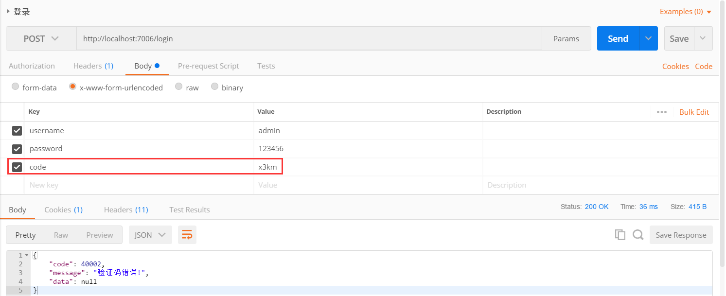 * 并且请求地址是 /login 时,获取参数中的 code 字段值,该字段保存了用户从前端页面传来的验证码,然后获取 session 中保存的验证码,