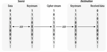 串流密码锁会用到称为密钥串流(keystream)的bit串流。密钥串流随后会与讯息结合,产生密文(ciphertext)。为了还原原始讯息,接收端会以相同的密钥串流处理密文。RC会利用异或(XOR)运算结合密钥串流与密文。过程如下: