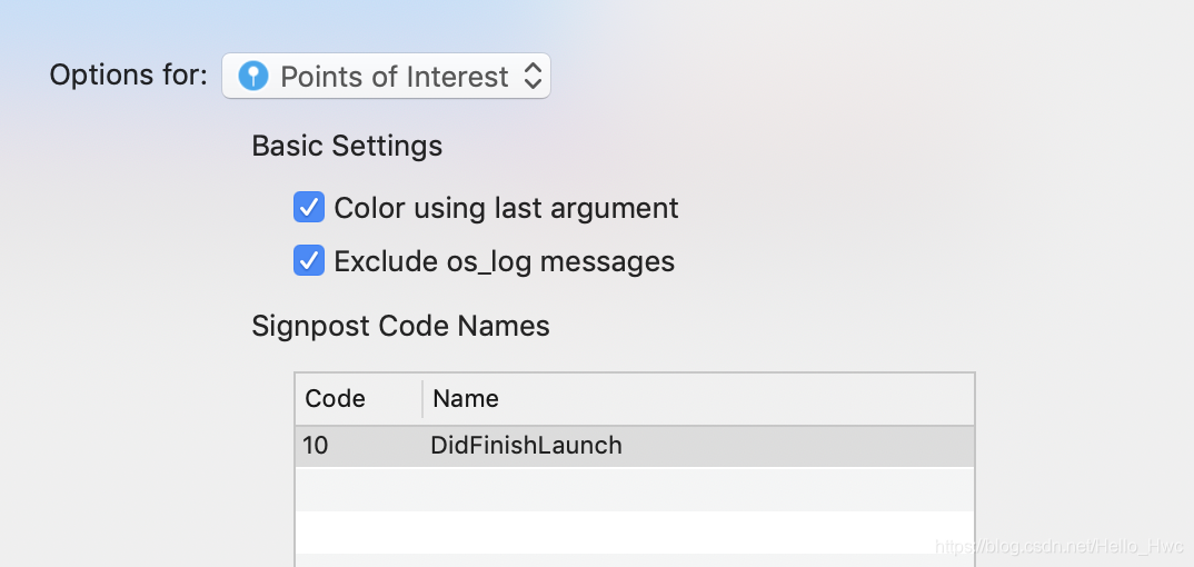 可以通过kdebug_signpost相关的接口相关的接口来打一些点,这些点会在Point of Interest区域中显示,比如刚刚的代码我们想标记出来didFinishLaunch这个方法,就可以在方法的收尾添加kdebug_interval: