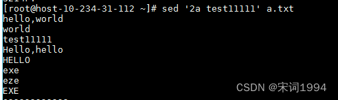 a:新增,a后面接字符为新增行内容(当前的下一行),sed '2a Hello' 在第2行下加Hello