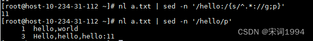 另外也可以用s用作删除。比如删除【:】符号之前的内容,nl a.txt | sed -n '/hello:/{s/^.*://g;p}'
