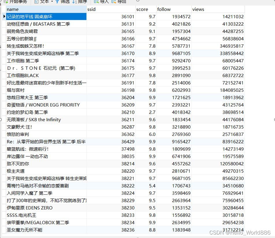 其中page参数是页面数,所以我们只需要修改page参数,就可以获取不同的动漫基本信息(动漫名称和SSID)获取到SSID后,再通过SSID来查找对应动漫的点赞数,追番数等信息。