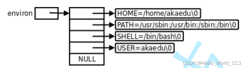 环境变量表的本质就是一个字符指针数组,这是一个数组,数组的每个元素存放的是字符串首地址,最终这个字符串以\0结尾,并且这个字符指针数组结尾是NULL