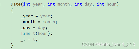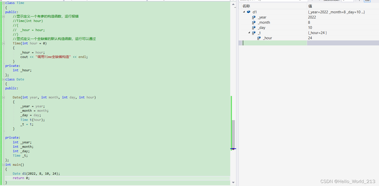 这里报错的原因:Date的构造函数对于内置类型不做处理,对于自定义类型调用其自己的默认构造函数,可以看到,由于Time类中我们显示写了有参构造,编译器就不会生成,自然就没有默认构造。如果我们用int hour = 0这样全缺省的构造就可以被调用了并且调用之后是我们想要的结果。