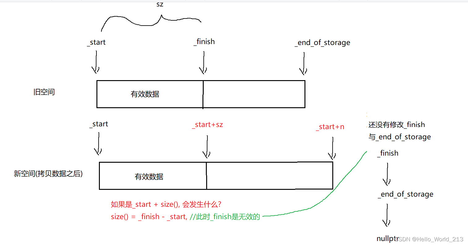 然后才能将新开辟的空间的_finish属性赋值为_start+sz, 否则size()将会发生错误