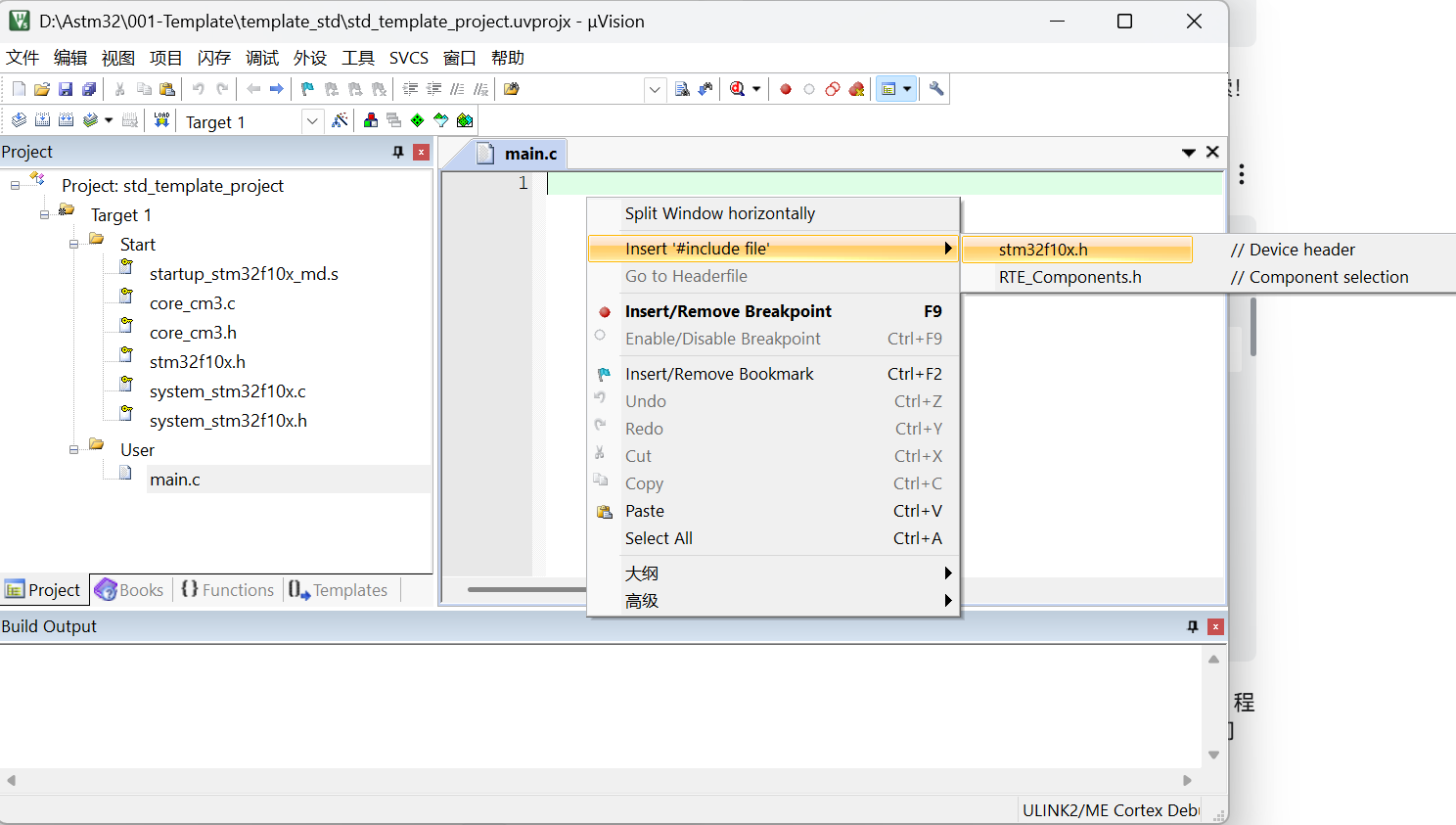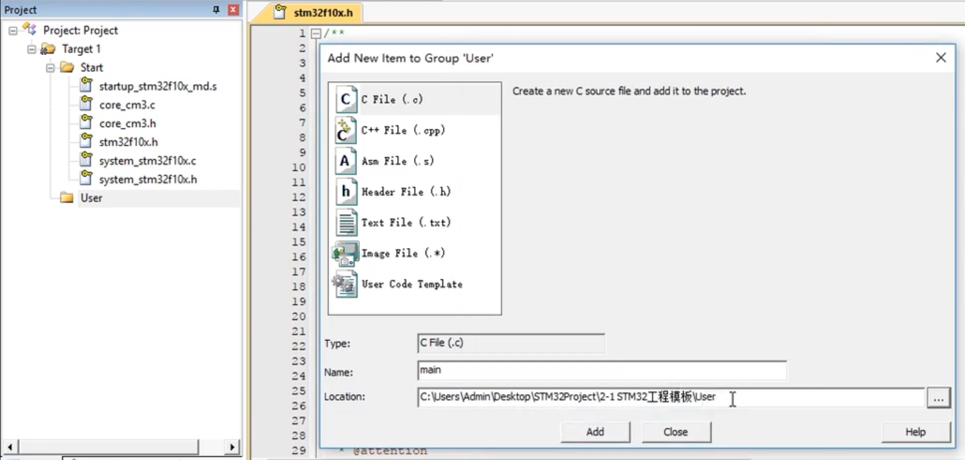 在Keil项目中Target1下新建Group并命名为User,在User中创建main.c