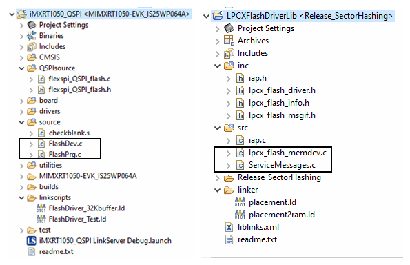 我们就以iMXRT1050_QSPI.zip示例包里代码来分析其结构设计。这个示例包包含两个工程(LPCXFlashDriverLib和iMXRT1050_QSPI),需要先编译LPCXFlashDriverLib工程生成libLPCXFlashDriverLib.a,这个库是iMXRT1050_QSPI工程的源文件,然后编译iMXRT1050_QSPI工程生成我们需要的算法文件MIMXRT1050-EVK_IS25WP064A.cfx。