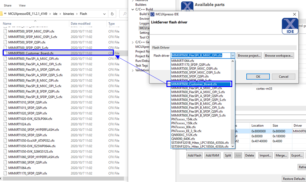 如果默认选择的Flash下载算法文件不适用你的板子,那么你需要自己提供合适的算法文件(.cfx),并将其放入MCUXpresso IDE安装目录下(\MCUXpressoIDE_11.2.1_4149\ide\binaries\Flash),重新打开工程选项,新增的算法会自动刷新到待选算法列表: