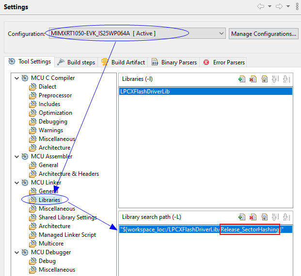 再到iMXRT1050_QSPI工程,这个工程就是采用具体MCU的内核指令集(CM7)来编译,在工程设置里可以看到链接了LPCXFlashDriverLib工程的Release_SectorHashing生成的.a文件,如果LPCXFlashDriverLib工程选择了其他build,这里也要相应改一下。