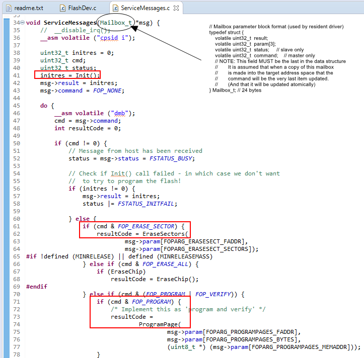MemoryDevice有一个成员是ServiceMessages()函数,这个函数可以说是算法最灵魂的部分了,它才是MCUXpresso IDE调试器调用Flash擦写API的真正入口,调试器通过传入msg参数(所谓Mailbox结构)让算法来执行具体Flash操作并得到执行结果。这种特殊的设计可能也是MCXPpresso IDE算法仅能在CMSIS-DAP类型仿真器下使用的原因吧。